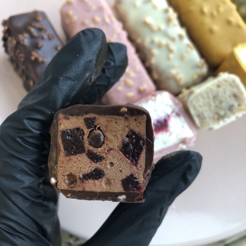 Обожаю горький шоколад! Как по мне, он невероятно вкусный. Делаю с ним ганаши в начинки макарон, глазирую зефир и эскимо. Горький шоколад придаёт десерту пикантность и терпкость. Я знаю, что этот шоколад не является самым популярным из-за высокого содержания какао продуктов, но я очень его люблю, он насыщенный, не очень сладкий, чувствуется настоящий вкус шоколада. Ещё очень люблю варить себе на завтрак горячий шоколад с использованием этого шоколада, получается насыщенный густой напиток, самое то для любителей шоколада. Фасовка 1 кг подойдёт тем, кто уже пробовал горький шоколад и точно знает, где и как его будет использовать. Я использую его достаточно активно и мне 1 кг хватает на 2-3 недели, иногда даже быстрее кончается. На фото батончик покрыт горький шоколадом.